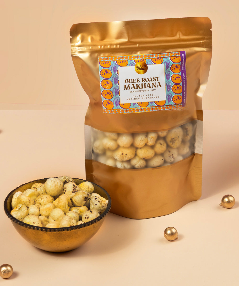 Crunchy makhanas slow-roasted in golden ghee and a dash of pepper for a wholesome, aromatic bite.